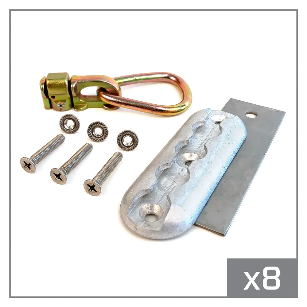 Offered as an eight-pack, each assembly includes one double stud anchor plate, one backing plate, one pear-shaped tie-down ring and three 1/4" stainless steel machine screws with whiz nuts. For long-lasting performance, the anchor plate is manufactured from aircraft-grade aluminum. The mild steel backing plate is zinc-dipped to inhibit corrosion. Stainless steel screws and self-locking whiz nuts are provided to attach the assembly to your structure to ensure years of trouble-free service.