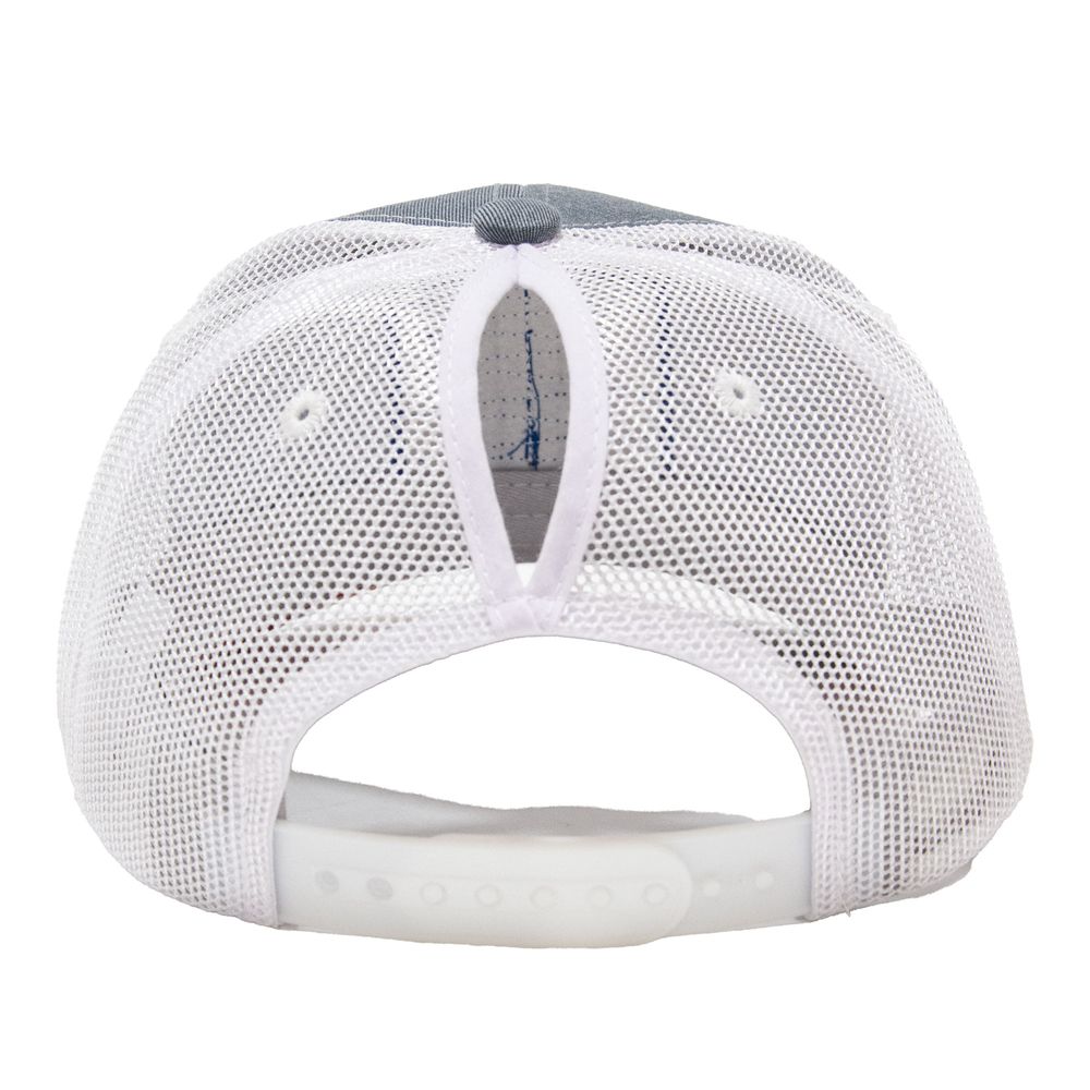 This trucker hat features a patriotic flag-themed Mac's "M" at the front and has a ponytail cutout at the back.
