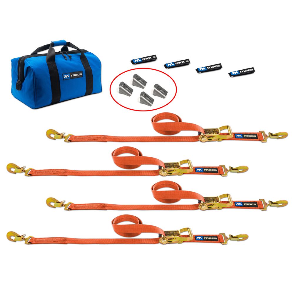 - What's included: (4) 8' Ratchet straps with sewn fixed ends, (4) strap wraps, (4) axle brackets, (1) large canvas storage bag