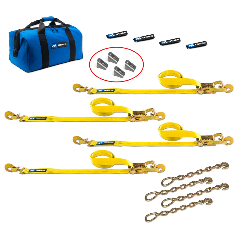 - What's included: (4) 8' Ratchet straps with direct hook ends, (4) chain extensions, (4) axle brackets, (4) strap wraps, (1) large canvas storage bag