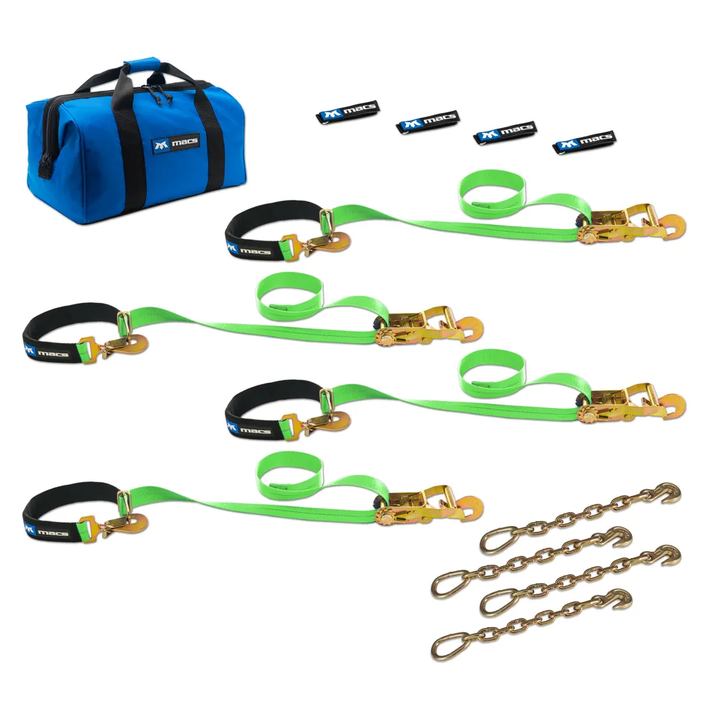 Two 6' & Two 8' Super Pack Tie-Down Strap Kit with Integrated Axle Straps, Direct Hook Ends & Chain Extensions - Lime Green