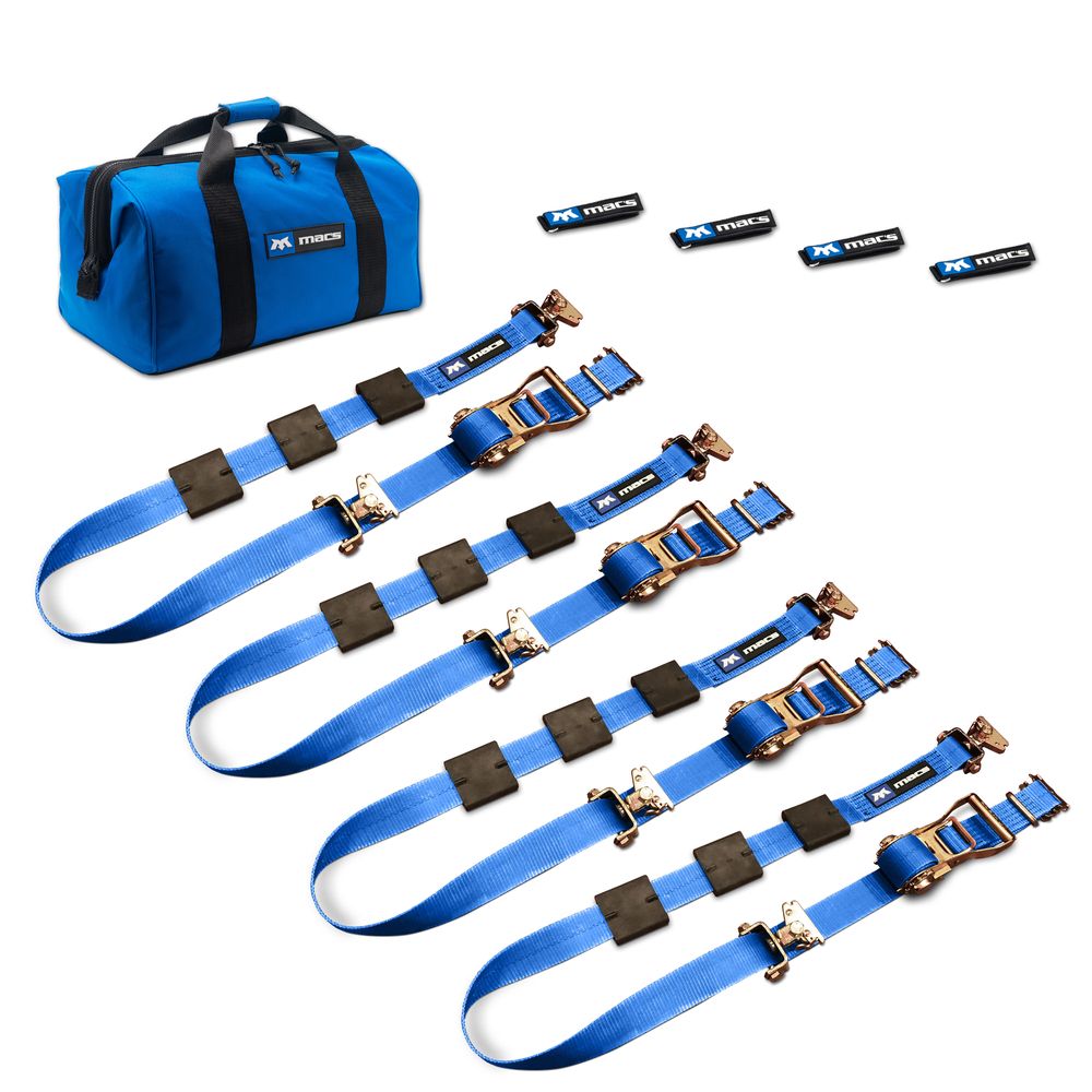 - What's included: (4) 10' Ratchet straps with tire blocks, (4) E-track idlers, (4) strap wraps and (1) large canvas storage bag