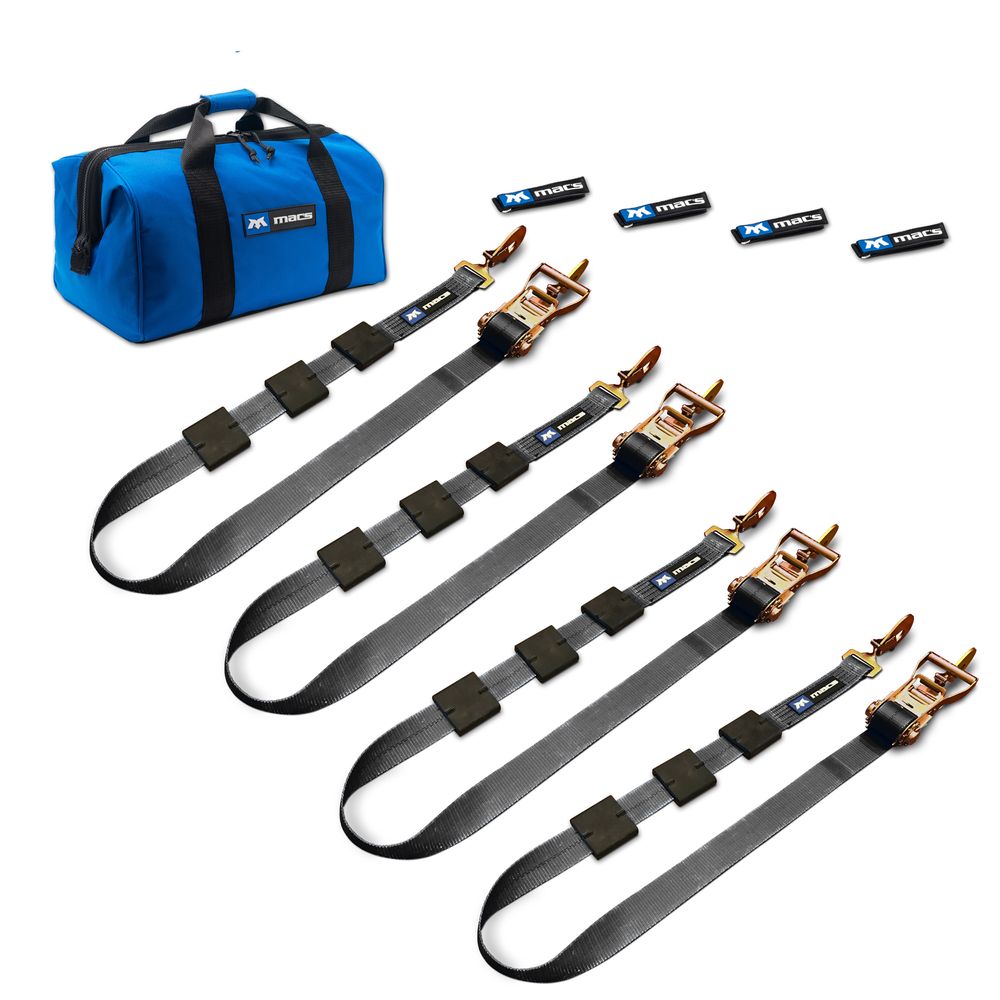 - What's included: (4) 10' Ratchet straps with tire blocks with twisted snap hook ends, (4) strap wraps and (1) large canvas storage bag