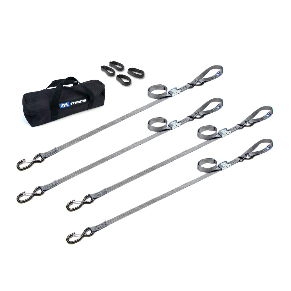 This pack includes four cam strap tie-downs with S-hook ends and keepers, four 18" integrated soft loops, four strap bands and one small storage bag. Mac's 1" tie-down straps (lashing straps) are well known for their strength and dependability. There's good reason why. It starts with our premium strapping. Rated to 4,000 lbs., the select nylon webbing material we use significantly improves chafing and UV resistance over "box store" straps. During construction of each strap, we sew all ends using the highest stitch count in the industry. You can see this in our characteristic "double box" stitch pattern that ensures maximum tear resistance. The result is a strap with an incredible 2,800 lb. Minimum Breaking Strength (MBS)--more than enough strength for the biggest bike or cargo (recommended working load is 1/3 MBS).