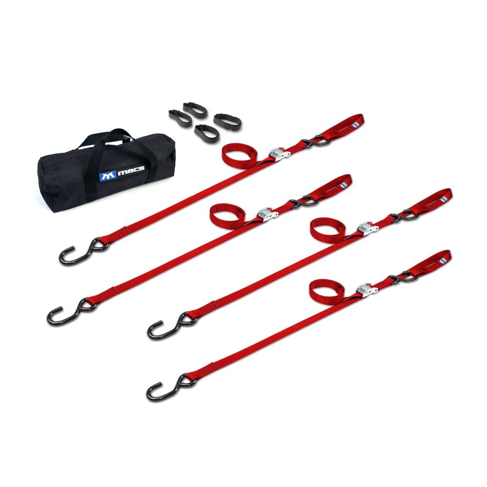 This pack includes four cam strap tie-downs with S-hook ends, four 18" integrated soft loops, four strap bands and one small storage bag. Mac's 1" tie-down straps are well known for their strength and dependability. There's good reason why. It starts with our premium strapping. Rated to 4,000 lbs, the select nylon webbing material we use significantly improves chafing and UV resistance over "box store" straps. Then, during construction of each strap, we sew all ends using the highest stitch count in the industry. You can see this in our characteristic "double box" stitch pattern that ensures maximum tear resistance. The result is a strap with an incredible 2,800 lb. Minimum Breaking Strength (MBS); more than enough strength for the biggest bike or cargo (recommended working load is 1/3 MBS).