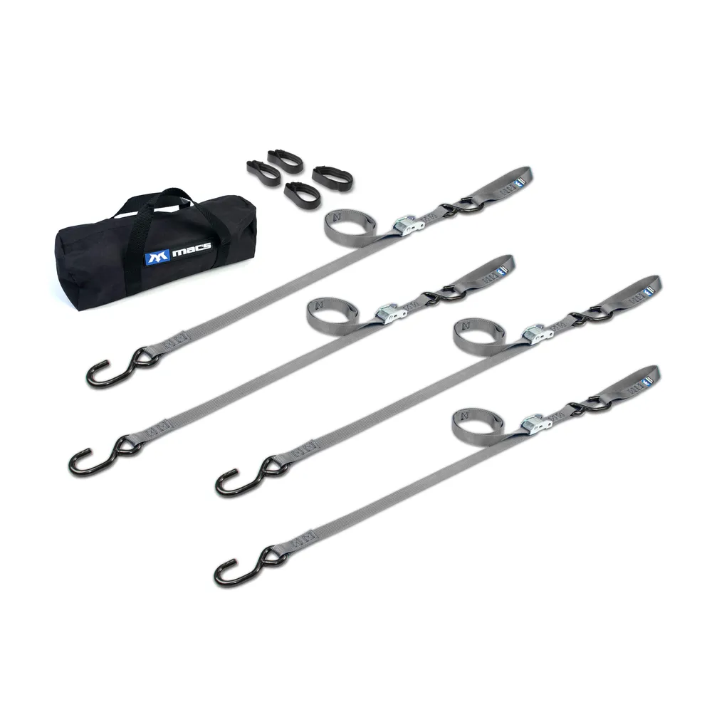This pack includes four cam strap tie-downs with S-hook ends, four 18" integrated soft loops, four strap bands and one small storage bag. Mac's 1" tie-down straps are well known for their strength and dependability. There's good reason why. It starts with our premium strapping. Rated to 4,000 lbs, the select nylon webbing material we use significantly improves chafing and UV resistance over "box store" straps. Then, during construction of each strap, we sew all ends using the highest stitch count in the industry. You can see this in our characteristic "double box" stitch pattern that ensures maximum tear resistance. The result is a strap with an incredible 2,800 lb. Minimum Breaking Strength (MBS); more than enough strength for the biggest bike or cargo (recommended working load is 1/3 MBS).