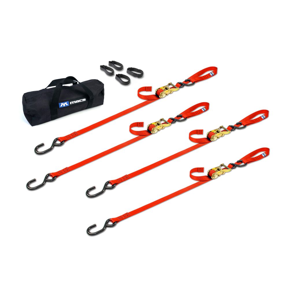 This pack includes four ratchet strap tie-downs with S-hook ends, four 18" integrated soft loops, four strap bands and one small storage bag. Mac's 1" tie-down straps (lashing straps) are well known for their strength and dependability. There's good reason why. It starts with our premium strapping. Rated to 4,000 lbs., the select nylon webbing material we use significantly improves chafing and UV resistance over "box store" straps. During construction of each strap, we sew all ends using the highest stitch count in the industry. You can see this in our characteristic "double box" stitch pattern that ensures maximum tear resistance. The result is a strap with an incredible 2,800 lb. Minimum Breaking Strength (MBS)--more than enough strength for the biggest bike or cargo (recommended working load is 1/3 MBS).