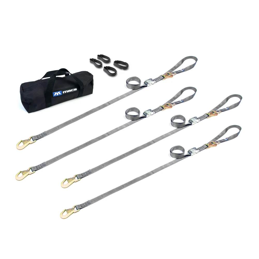 This pack includes four cam strap tie-downs with flat snap hook ends, four 18" integrated soft loops with D-rings, four strap bands and one small storage bag. Mac's 1" tie-down straps are well known for their strength and dependability. There's good reason why. It starts with our premium strapping. Rated to 4,000 lbs, the select nylon webbing material we use significantly improves chafing and UV resistance over "box store" straps. Then, during construction of each strap, we sew all ends using the highest stitch count in the industry. You can see this in our characteristic "double box" stitch pattern that ensures maximum tear resistance. The result is a strap with an incredible 2,800 lb. Minimum Breaking Strength (MBS); more than enough strength for the biggest bike or cargo (recommended working load is 1/3 MBS).