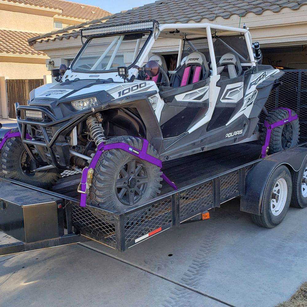 Developed specifically for the UTV and side-by-side market, our UTV E-Track Tire Net Pack uses our quality webbing to lock your wheels in place while allowing the vehicle's suspension to smoothly absorb bumps in the road.