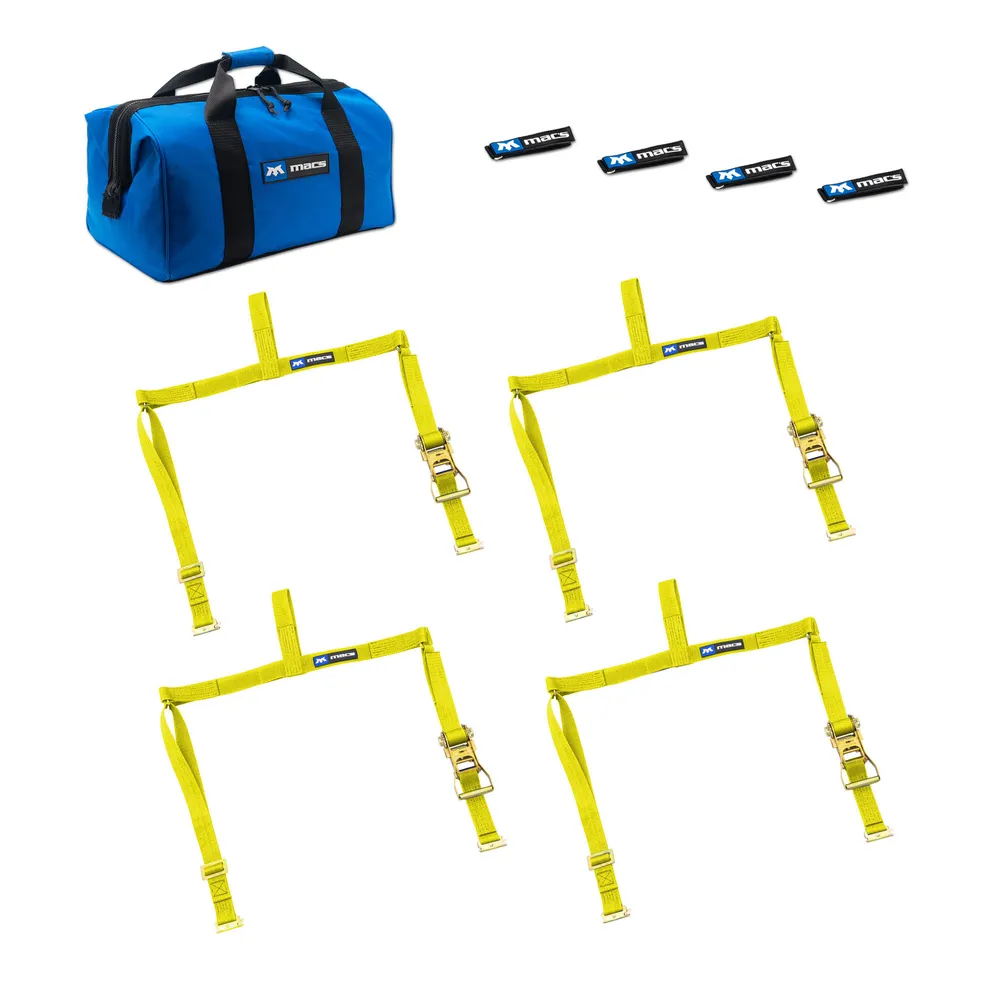 The adjustable design means you can still use it if you choose to run the OEM tires for a while before deciding to upgrade to a different or larger tire. A simple adjustment allows you to use this on those smaller stock tires as well as on a larger aftermarket choice. Your UTV Tire Net Pack comes with Mac's Strap Wraps. After securing your vehicle, use these to neatly hold excess strapping in place and store them in the included bag.