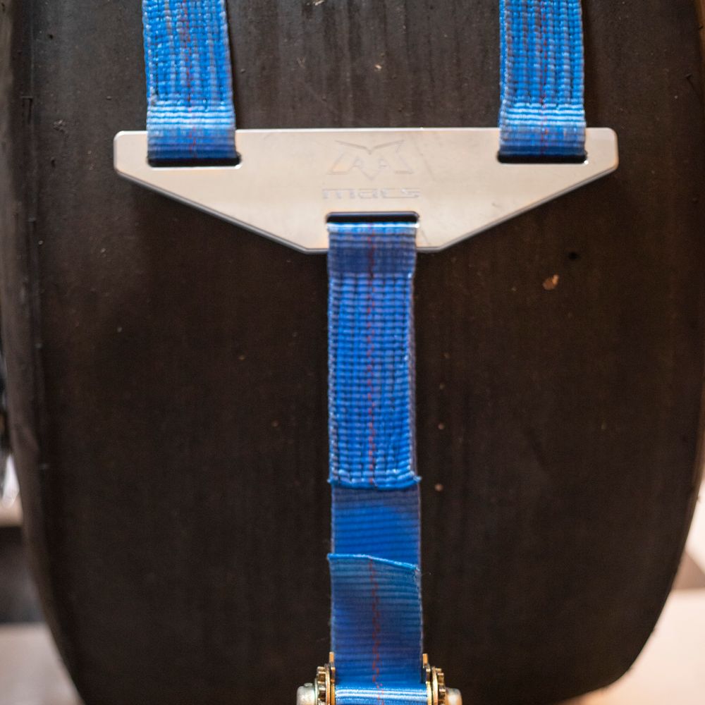 Because using a single strap on a rear oversized, soft dragster tire can damage the tire in transit, Mac's Rear Spreader Bar Nets are built with two billet aluminum spreader bars that disperse the load and eliminate a center groove left on the tire by a standard single strap. The Rear Spreader Bar Nets feature a twisted snap hook on the fixed end and a direct hook ratchet for tensioning.