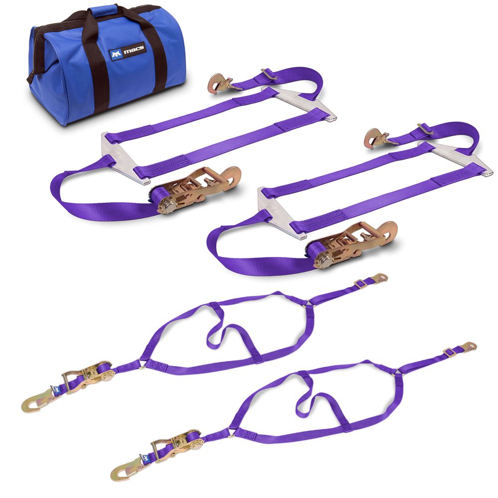 Mac's Full Drag Pack is the ideal solution for getting your dragster from the garage to the track and back again safely. Whether you need anchor points or your trailer already has proper hardware installed, we have an option for you! This full drag pack includes two front drag nets with flat snap hooks and two rear spreader bar nets with twisted snap hooks. Store it all together in the convenient duffle bag.