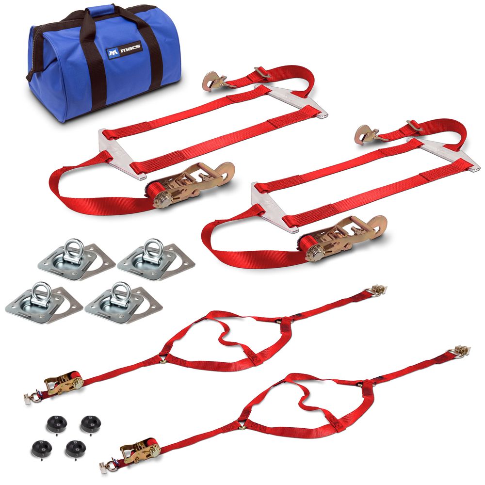 Mac's Full Drag Pack is the ideal solution for getting your dragster from the garage to the track and back again safely. Whether you need anchor points or your trailer already has proper hardware installed, we have an option for you! This full drag pack includes two front drag nets with single stud rings, four VersaTie single stud anchor plate assemblies, two rear spreader bar nets with twisted snap hooks, and four recessed D-rings and backing plates. Store it all together in the convenient duffle bag.