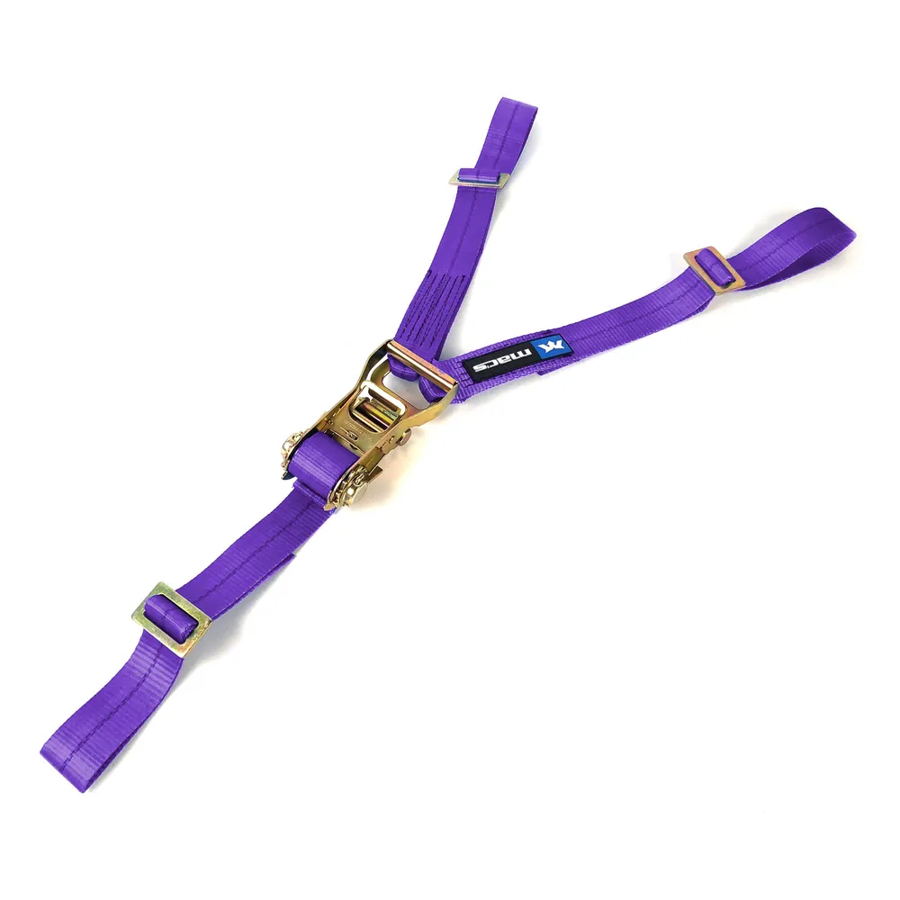 Mac's Y-Strap is built to survive. This racer-first approach to our equipment is also why Mac's Y-Straps look so good. Our Y-Strap is rated to 5,000 lb. Minimum Breaking Strength (MBS), giving you plenty of safety margin. The foundation of our Y-Strap is our premium webbing. This is the same 12,000 lb-rated material used on our vehicle tie-down straps. It offers superior UV and abrasion resistance, so you can count on years of survival through rough terrain. But strap assemblies are only as good as the stitching that holds them together. That's why each connection on a Mac's Y-Strap is sewn using the highest stitch count in the industry. All metal components on our Y-Strap now include our improved zinc coating for even better corrosion resistance.