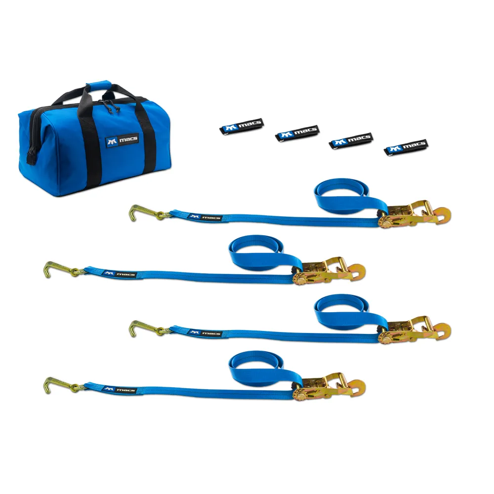 This factory transit tie-down pack includes four 2" x 8' ratchet straps with J-hooks and direct hook ends, four strap wraps and one large canvas storage bag.