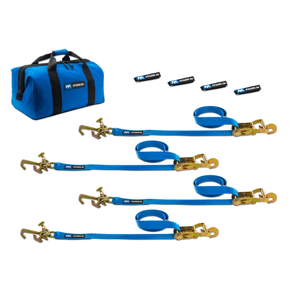 This factory transit tie-down pack includes four 2" x 8' ratchet straps with our transit cluster hooks (J-, T- and R-hook combined into one assembly) and direct hook ends, four strap wraps and one large canvas storage bag.