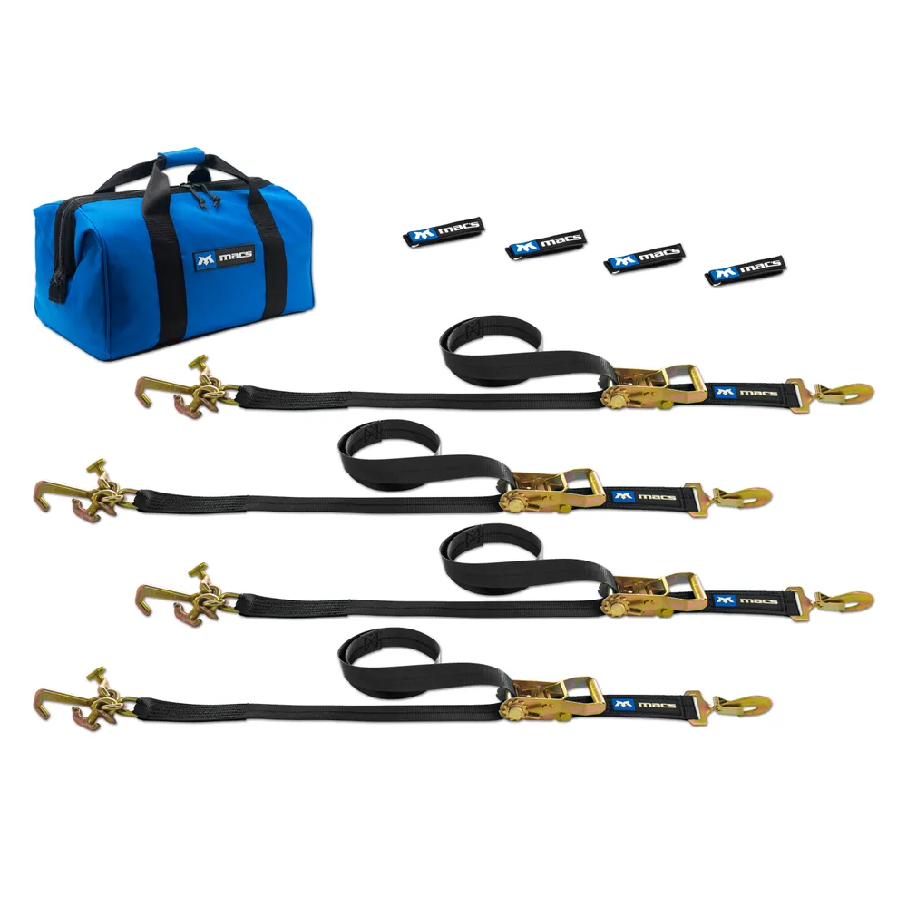 This factory transit tie-down pack includes four 2" x 8' ratchet straps with our transit cluster hooks (J-, T- and R-hook combined into one assembly) and sewn ends, four strap wraps and one large canvas storage bag.