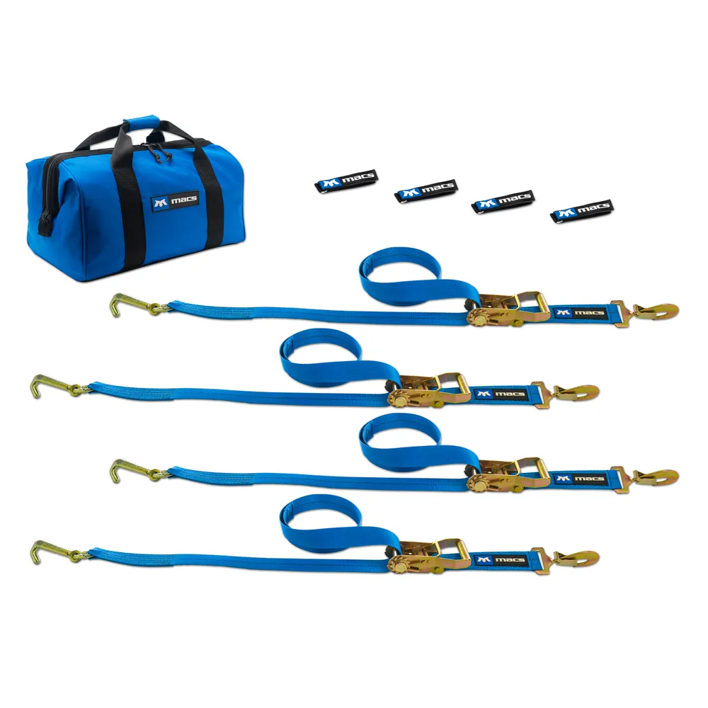 This factory transit tie-down pack includes four 2" x 8' ratchet straps with J-hooks and sewn ends, four strap wraps and one large canvas storage bag.