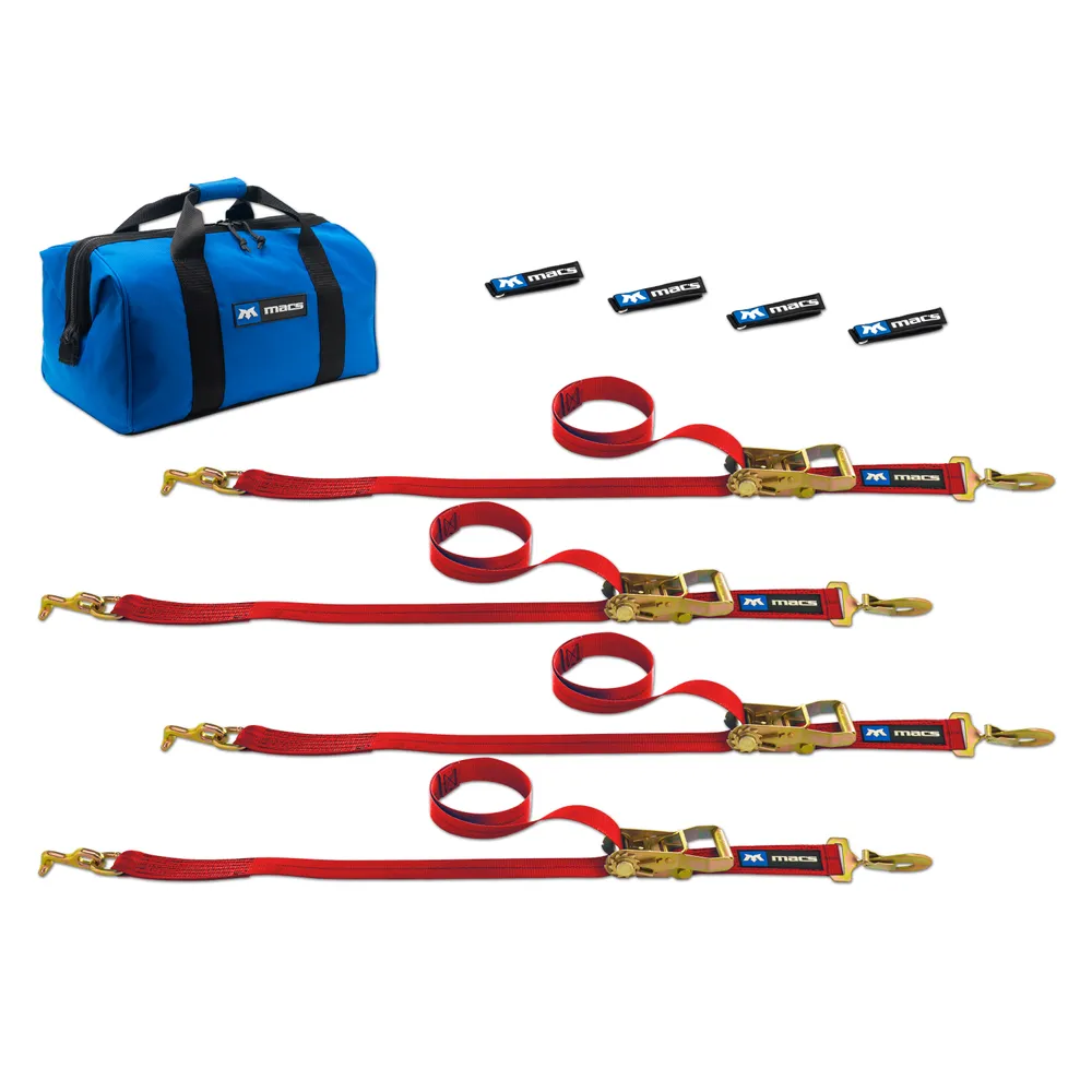 The strap wraps neatly hold excess strapping in place after the vehicle is secured, and when you've arrived, store your bundled tie-downs in the included Mac's Large Canvas Tool Bag.