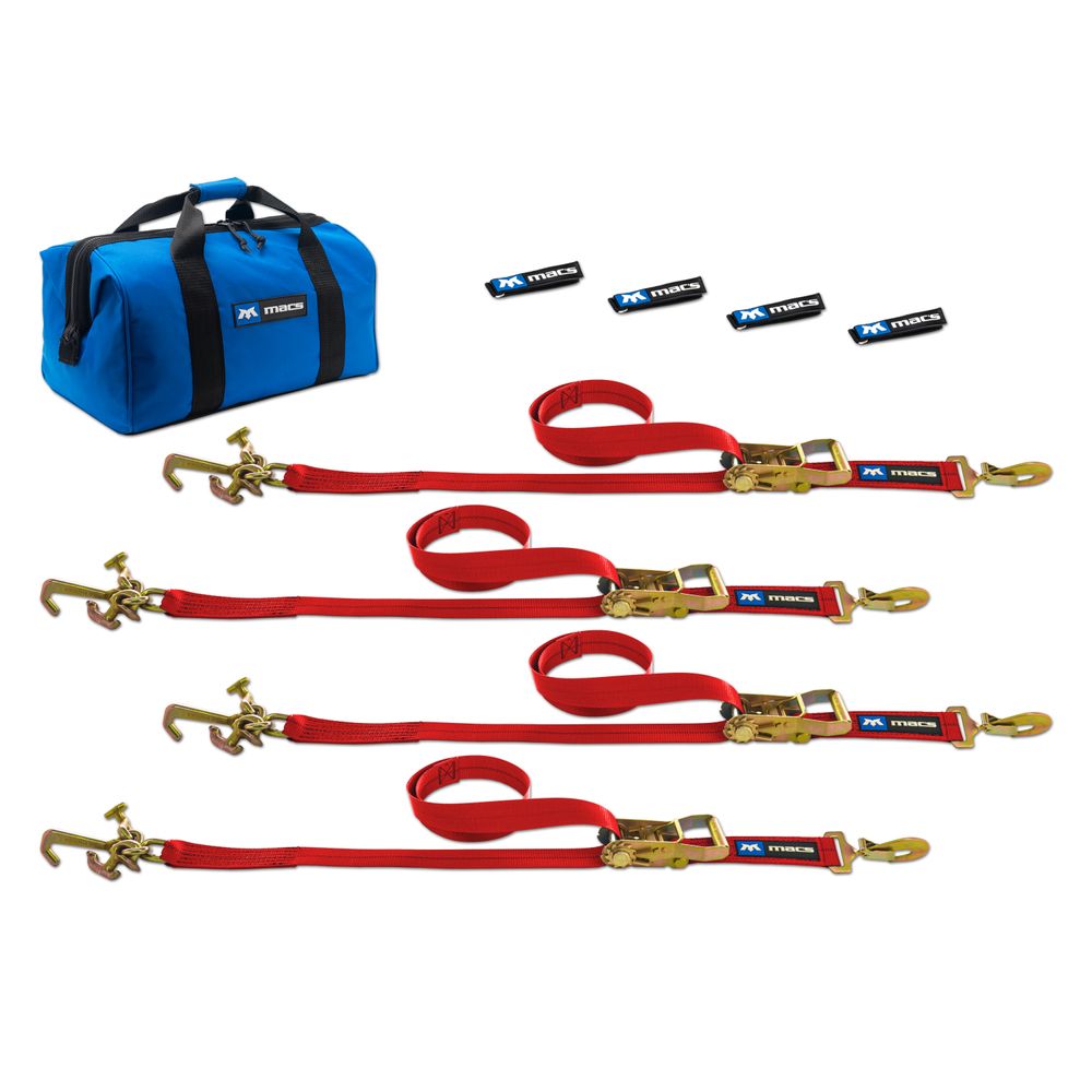 The strap wraps neatly hold excess strapping in place after the vehicle is secured, and when you've arrived, store your bundled tie-downs in the included Mac's Large Canvas Tool Bag.