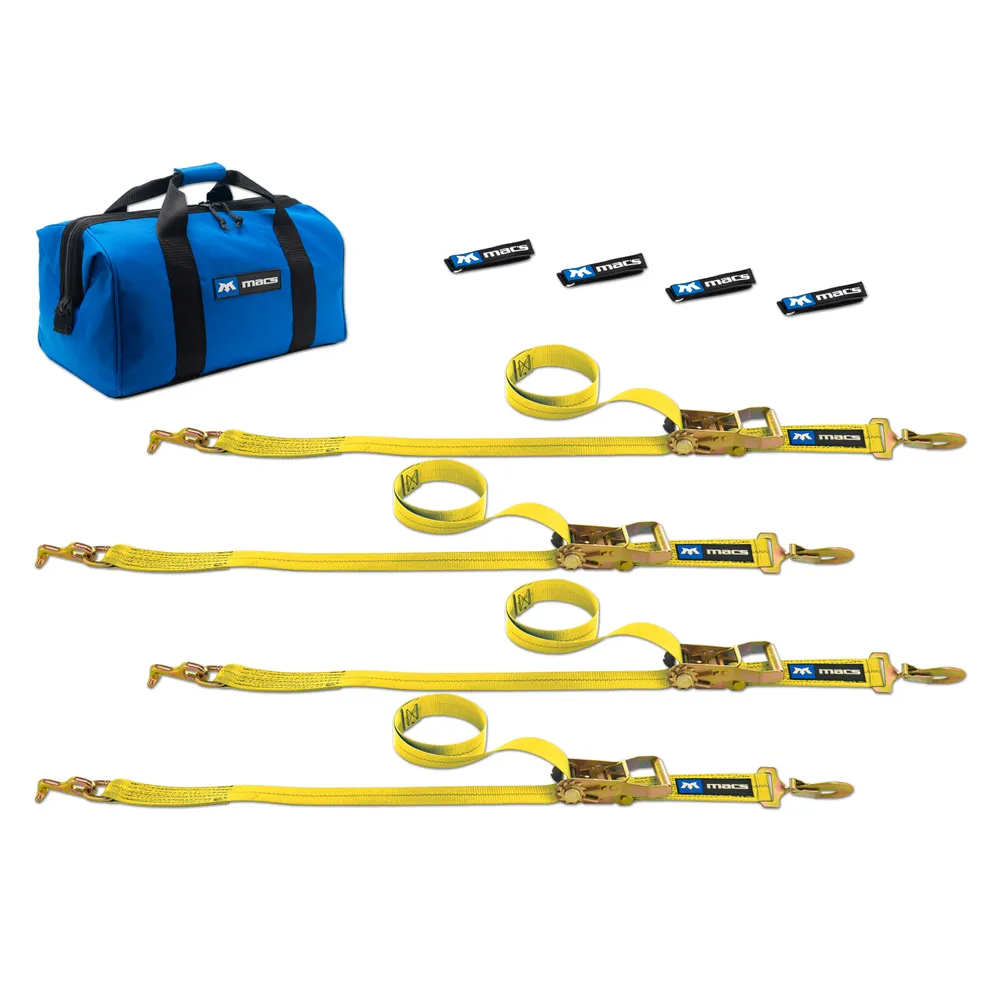 This factory transit tie-down pack includes four 2" x 8' ratchet straps with T-hooks and sewn ends, four strap wraps and one large canvas storage bag.