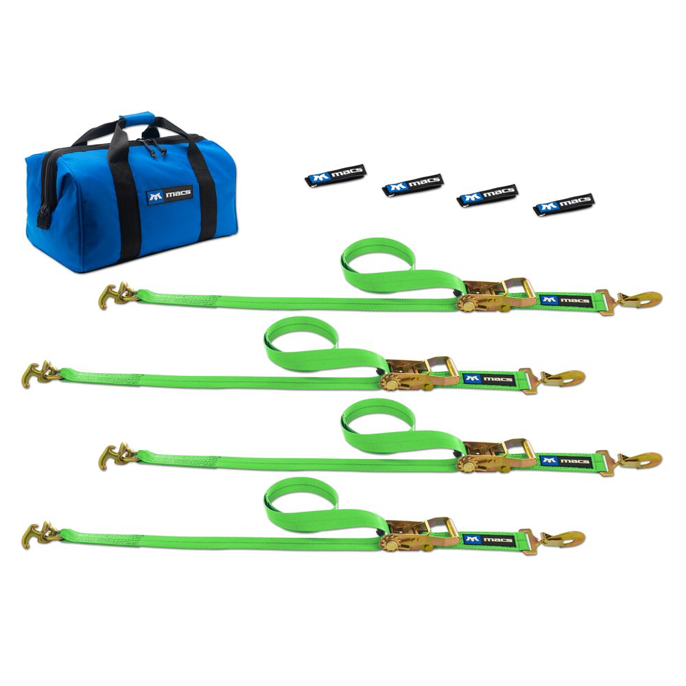 This factory transit tie-down pack includes four 2" x 8' ratchet straps with R-hooks and sewn ends, four strap wraps and one large canvas storage bag.