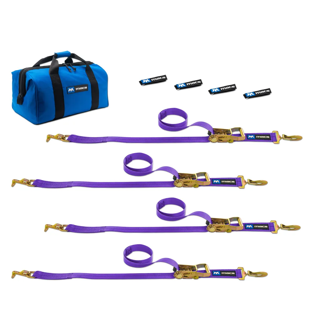 The strap wraps neatly hold excess strapping in place after the vehicle is secured, and when you've arrived, store your bundled tie-downs in the included Mac's Large Canvas Tool Bag.