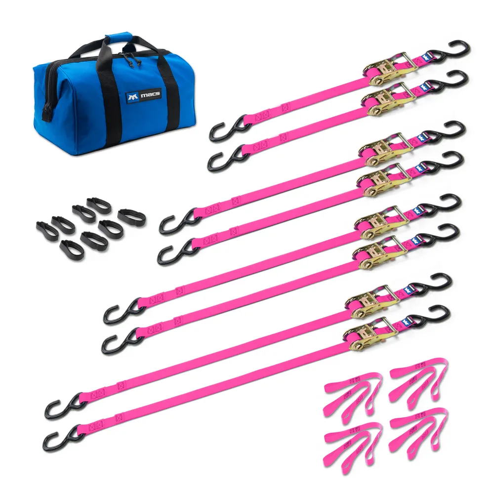 - What's included: (2) 6', (2) 8', (2) 10' and (2) 12' ratchet straps, (8) soft loops, (8) strap wraps, (1) large canvas storage bag