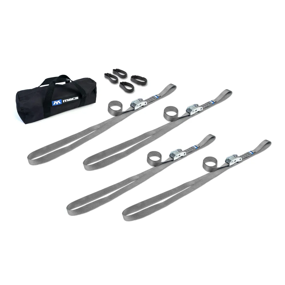 - What's included: (4) 10' Continuous loop cam straps, (4) strap bands and (1) small duffle bag