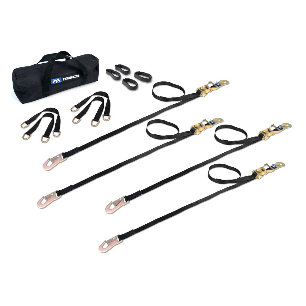 The ATV/Motorcycle Utility Pack includes four 1" ratchet tie-down straps with flat snap hook ends, four 18" soft loops, four strap bands and one small duffle bag. Mac's 1" tie-down straps are well known for their strength and dependability, and there's a good reason why. It starts with our premium nylon strapping, rated to 2,800 lbs. Minimum Break Strength (MBS), which significantly improves chafing and UV resistance over box store straps. The flat snap hook system features pring-loaded captive hooks at each end, which prevents the strap from disconnecting even when slack develops. This makes securing cargo easier and is an added measure of safety for the journey. With the flat snap hook version, the soft loop extensions have a D-Ring sewn into each end. Remember, you always want to connect metal to metal so as to prevent wear of the webbing and potential strap failure. Flat snap hooks can be used with most anchor points (e.g., D-Rings) or track systems (e.g., VersaTie, E-Track, etc.), provided the hard points and fittings support the load requirement; they are zinc-plated for corrosion protection.