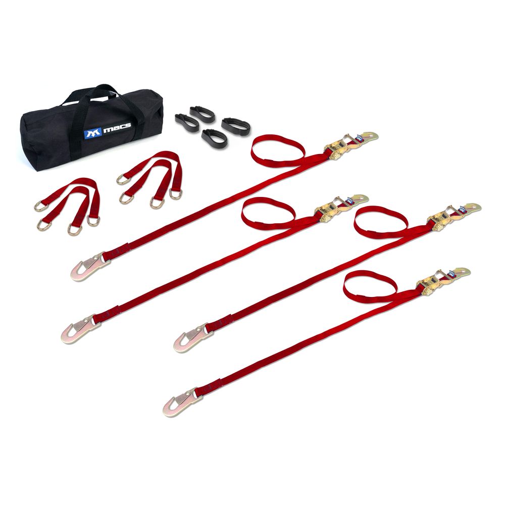 The ATV/Motorcycle Utility Pack includes four 1" ratchet tie-down straps with flat snap hook ends, four 18" soft loops, four strap bands and one small duffle bag. Mac's 1" tie-down straps are well known for their strength and dependability, and there's a good reason why. It starts with our premium nylon strapping, rated to 2,800 lbs. Minimum Break Strength (MBS), which significantly improves chafing and UV resistance over box store straps. The flat snap hook system features pring-loaded captive hooks at each end, which prevents the strap from disconnecting even when slack develops. This makes securing cargo easier and is an added measure of safety for the journey. With the flat snap hook version, the soft loop extensions have a D-Ring sewn into each end. Remember, you always want to connect metal to metal so as to prevent wear of the webbing and potential strap failure. Flat snap hooks can be used with most anchor points (e.g., D-Rings) or track systems (e.g., VersaTie, E-Track, etc.), provided the hard points and fittings support the load requirement; they are zinc-plated for corrosion protection.