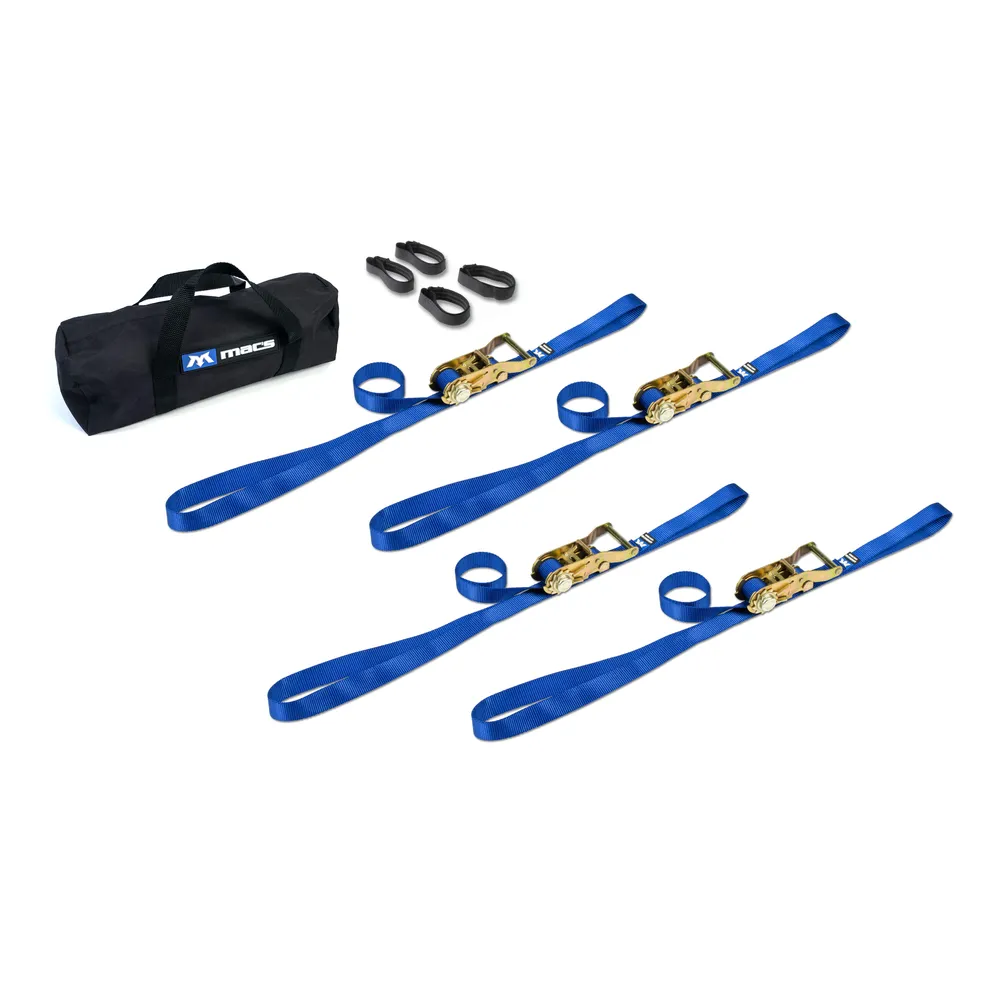 - What's included: (4) 4' Continuous loop ratchet straps, (4) strap bands and (1) small duffle bag
