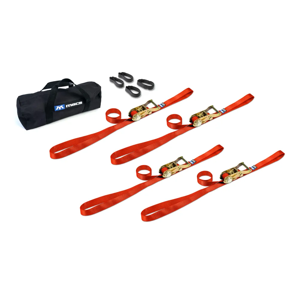 - What's included: (4) 4' Continuous loop ratchet straps, (4) strap bands and (1) small duffle bag