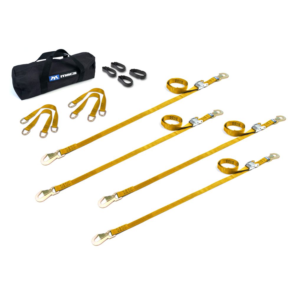 The ATV/Motorcycle Utility Pack includes four 1" cam buckle tie-down straps with flat snap hook ends, four 18" soft loops, four strap bands and one small duffle bag. Mac's 1" tie-down straps are well known for their strength and dependability, and there's a good reason why. It starts with our premium nylon strapping, rated to 2,800 lbs. Minimum Break Strength (MBS), which significantly improves chafing and UV resistance over box store straps.