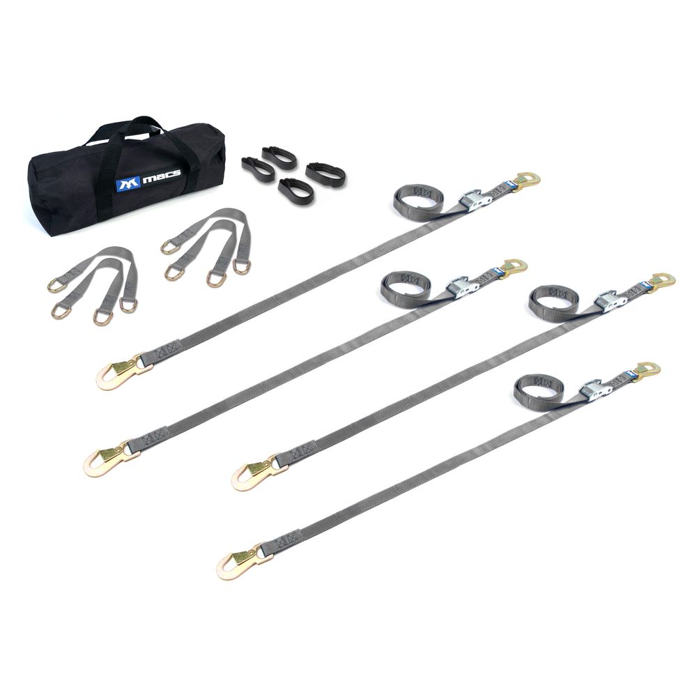The ATV/Motorcycle Utility Pack includes four 1" cam buckle tie-down straps with flat snap hook ends, four 18" soft loops, four strap bands and one small duffle bag. Mac's 1" tie-down straps are well known for their strength and dependability, and there's a good reason why. It starts with our premium nylon strapping, rated to 2,800 lbs. Minimum Break Strength (MBS), which significantly improves chafing and UV resistance over box store straps.