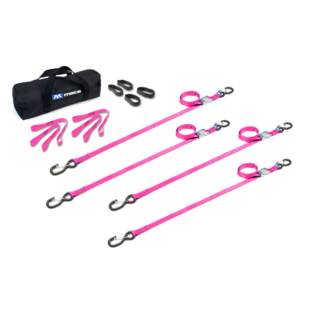 The ATV/Motorcycle Utility Pack includes four 1" cam buckle tie-down straps with S-hook ends and keepers, four 18" soft loops, four strap bands and one small duffle bag. The S-Hooks on each of the tie downs are encased in a full coat of thick, ruggedized vinyl. Mac's 1" tie-down straps are well known for their strength and dependability, and there's a good reason why. It starts with our premium nylon strapping, rated to 2,800 lbs. Minimum Break Strength (MBS), which significantly improves chafing and UV resistance over box store straps.