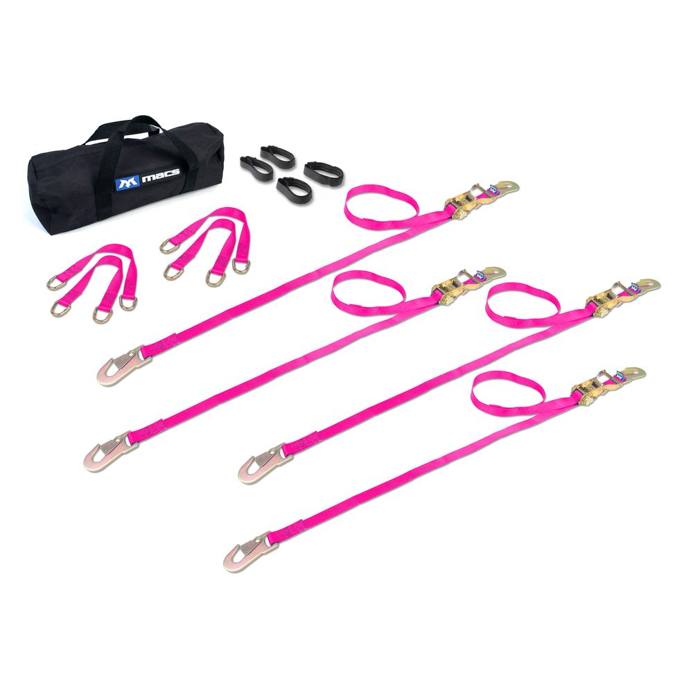 The ATV/Motorcycle Utility Pack includes four 1" ratchet tie-down straps with flat snap hook ends, four 18" soft loops, four strap bands and one small duffle bag. Mac's 1" tie-down straps are well known for their strength and dependability, and there's a good reason why. It starts with our premium nylon strapping, rated to 2,800 lbs. Minimum Break Strength (MBS), which significantly improves chafing and UV resistance over box store straps. The flat snap hook system features pring-loaded captive hooks at each end, which prevents the strap from disconnecting even when slack develops. This makes securing cargo easier and is an added measure of safety for the journey. With the flat snap hook version, the soft loop extensions have a D-Ring sewn into each end. Remember, you always want to connect metal to metal so as to prevent wear of the webbing and potential strap failure. Flat snap hooks can be used with most anchor points (e.g., D-Rings) or track systems (e.g., VersaTie, E-Track, etc.), provided the hard points and fittings support the load requirement; they are zinc-plated for corrosion protection.